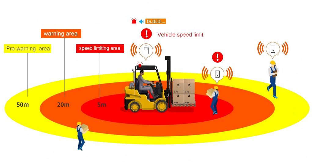 Our Tag-Based Forklift Pedestrian Proximity Alert System uses a host on the forklift and P-tags worn by pedestrians. The host monitors P-tags in real-time within a 100-meter range. It carefully judges the danger level based on distance. Then, it triggers different sound and light alarms to keep everyone safe.