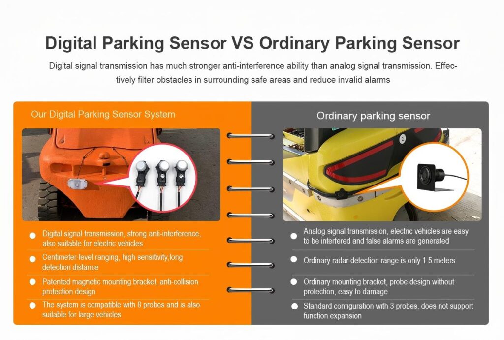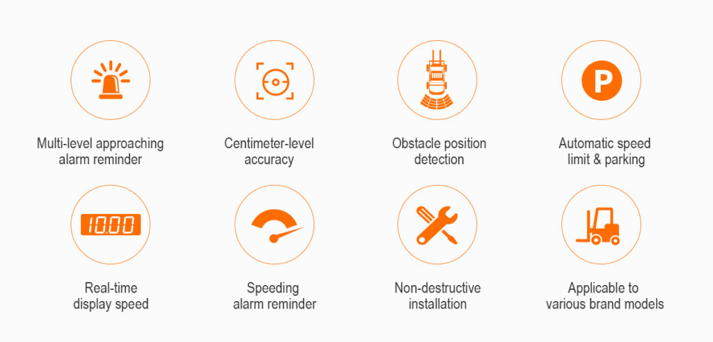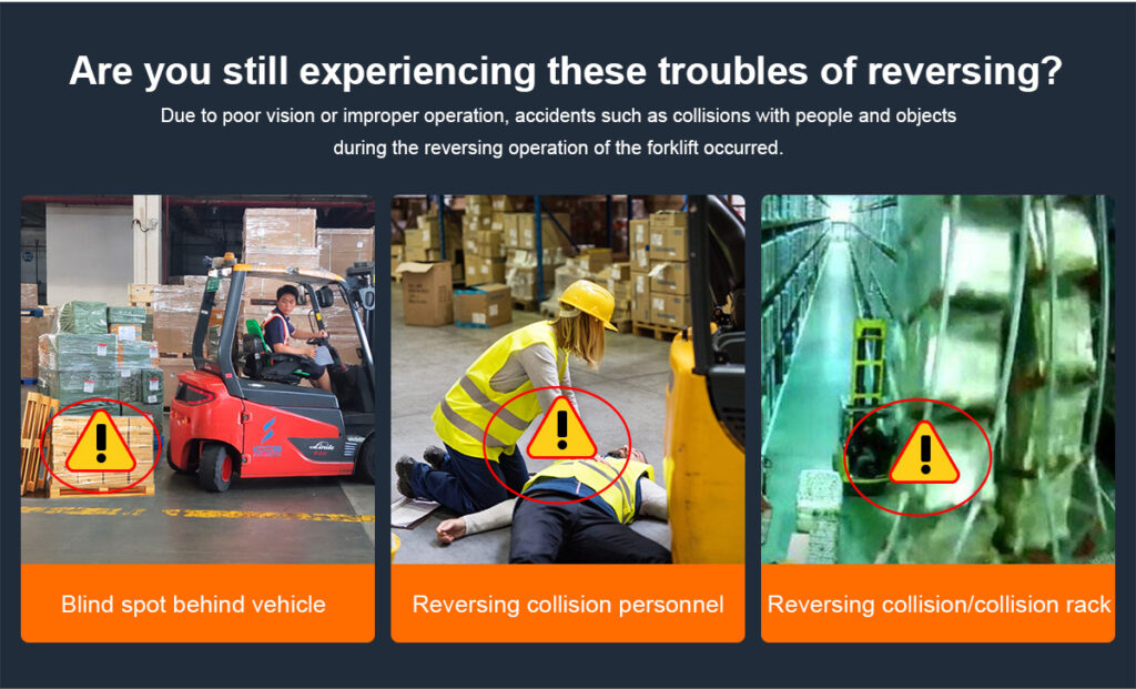 By continuously detecting people, vehicles, and objects behind the forklift, the system provides clear audible and visual warnings and can automatically limit reverse speed when danger is detected.