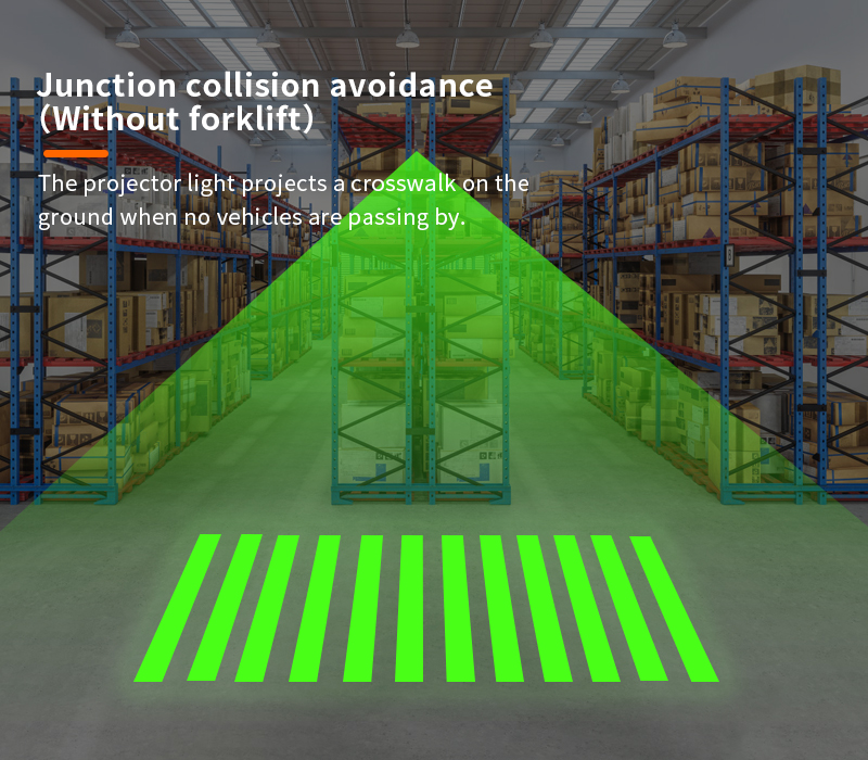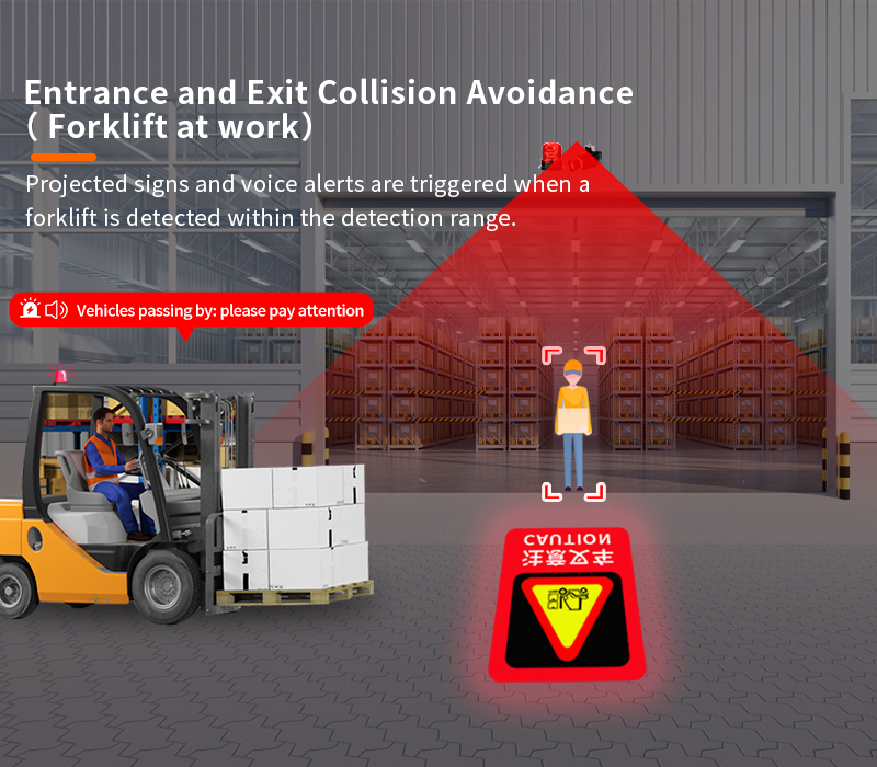 In warehouse entrances, passageways, and intersections—areas characterized by limited visibility and high ambient noise—the risk of pedestrian-vehicle collisions is significantly elevated. To mitigate this hazard, our system deploys dynamic ground-projected signage (e.g., “STOP – VEHICLE APPROACHING” or customizable red warning symbols), synchronized with audible voice alerts (“Caution: Vehicle Entering—Do Not Cross”) and high-intensity visual warnings (flashing strobes). These cues activate automatically upon detection of forklifts or other industrial vehicles within a predefined sensor range. When no vehicle is present, the system displays a green pedestrian crosswalk symbol, signaling safe passage.